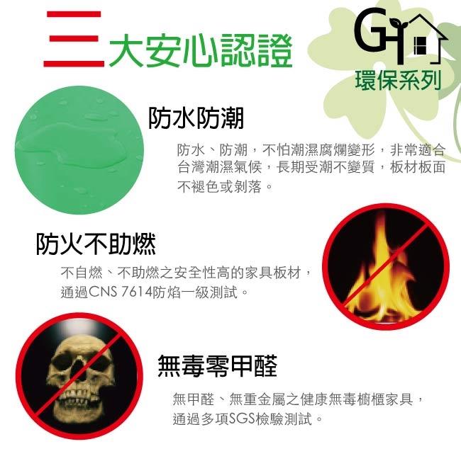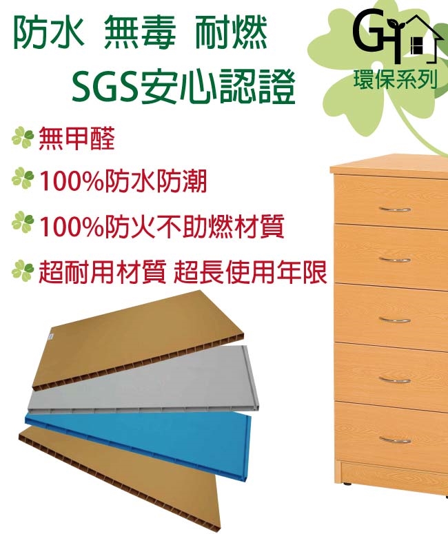 防水+防燃+無甲醛安心塑鋼材質,結構牢固耐用,也不用擔心蟲蛀的煩惱,使用放心